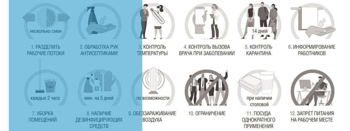 Измерять температуру на входе в офис и в течение рабочего дня, не пускать на рабочее место тех, у кого есть температура, признаки инфекционного заболевания.